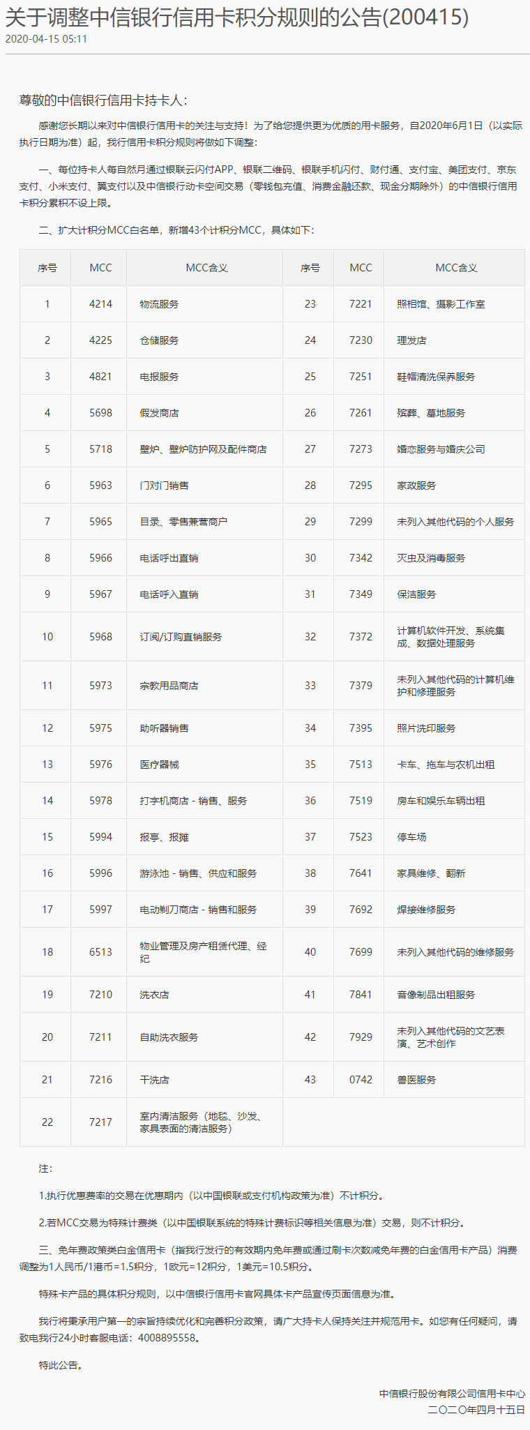 中信的两条公告归纳下,要点就是:线上积分无上限随便整、线下交易计积分的商户类别新增43个、航空联名卡线上交易可获里程。